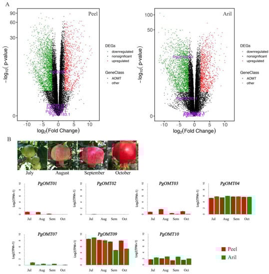 Some research has revealed that AOMT genes play roles in anthocyanin methylation that influence the plant coloration and improve self-protection from environmental stress [,]. To gain insight into the functions of the PgAOMT genes in the development of aril and peel, the expression patterns of PgOMT genes in aril and peel were analyzed using public RNA-Seq data from NCBI (Figure 3A). The volcano plot analysis showed that PgOMT09 in aril was significantly down-regulated (Figure 3A). The DEG analyses demonstrated that PgOMT09 played pivotal roles in aril development.