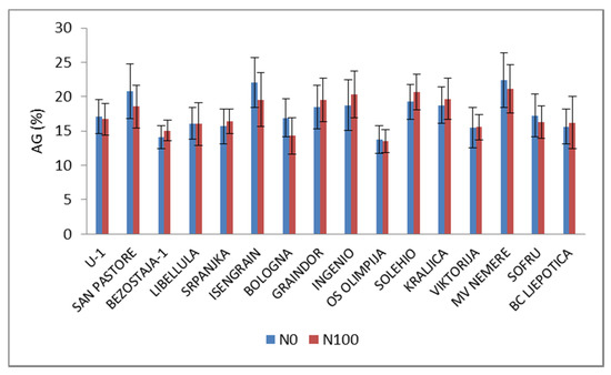 Some authors [12,17,28] noted that AG remained nearly unaffected under the higher N level, while Rekowski et al. [29] reported that late N supply significantly increased AG by 8–9%.