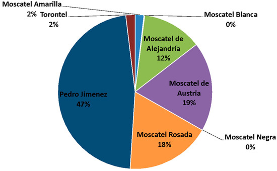 Varieties cultivated in Northern Chile intended for Pisco elaboration (in percentage). Moscatel Amarilla: 166.0 ha; Moscatel Blanca: 15.9 ha; Moscatel de Alejandría: 1711.2 ha; Moscatel Negra: 0.68 ha; Moscatel Rosada: 1630.3 ha; Pedro Jiménez: 4298.9 ha; Torontel: 179.41 ha. Figure elaborated based onto the data provided by SAG [4].