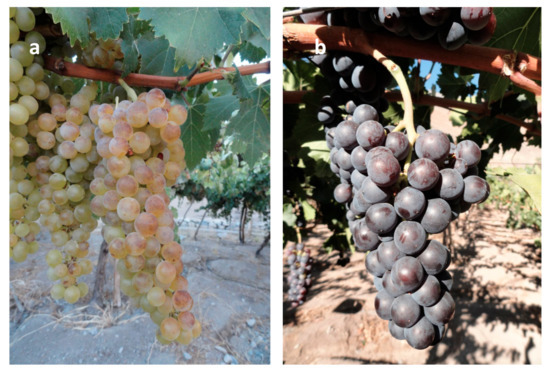 Clusters of autochthonous varieties not used commercially and authorized for the production of Pisco in accordance with Chilean alcohol regulation. (a) Moscatel Amarilla. (b) Moscatel Negra.