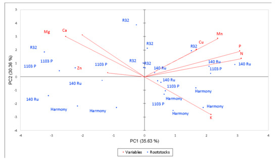 In order to classify the different rootstocks and assess their influence on blade nutrient content in both varieties, a principal component analysis (PCA) was performed (Figure 3). Principal component 1 (PC 1) explained 35.63% of the variance and principal component 2 (PC2) explained 30.36%, representing 65.99% of all the analysed variance. PC 1 was correlated (−) with Mg (and Ca), and (+) N, P and Mn, whereas PC 2 was (−) correlated with K, and (+) Ca, Mg and Mn. Depending upon season and variety, Harmony and 1103 Paulsen rootstocks were (+) correlated with K, and (−) correlated with Mg and Ca blade content. Conversely, 140 Ru and 1103 P were (+) correlated to P and N blade content and (−) correlated to Harmony rootstock respectively. Similar behaviour regarding season was observed for R32 and 1103 P rootstocks, which were (+) correlated to Zn, Mg and Ca blade content. Pearson correlations confirmed some relationships (Supplementary Table S3), such as N blade content that was (+) related to P (r = 0.87) and Mn, (r = 0.58). P blade content was (+) related to Mn (r = 0.63). K blade content was (−) related to Ca (r = −0.68) and Mg (r = −0.77). Ca blade content was (+) correlated with Mg (r = 0.75). Mn blade content was (+) correlated with Cu (r = 0.62).