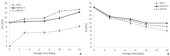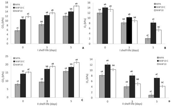 Furthermore, during the first and the second shelf-life, a decrease in O2 and an increase in CO2 in-packages levels were detected for all the modified atmosphere packaging (MPA, MAP10, and MAP10 C) (Figure 2A–D).