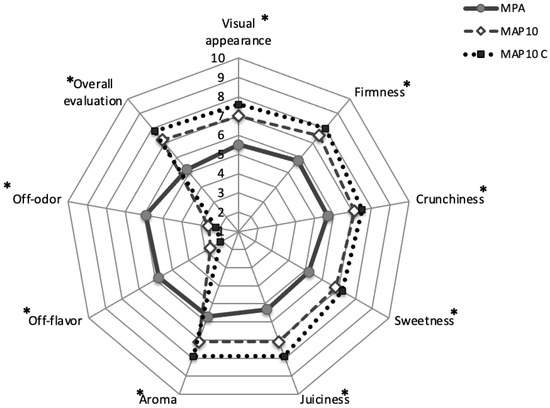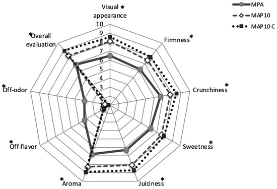 Sensorial analysis of ready-to-eat table grape (cv. ‘Italia’) sealed in continuous polyethylene film under passive (MPA) and active modified atmosphere treated with chitosan (MAP10 C) and non-treated (MAP10) evaluated at end of the second shelf-life (14 days at 5 °C plus 5 days at 20 °C). * indicate differences (Tukey’s test at p ≤ 0.05) between the MPA and MAP treatments (n = 30).