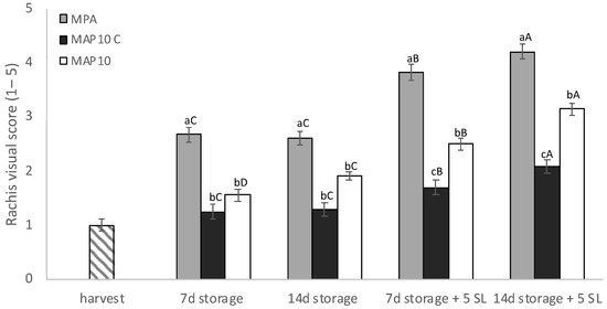 Effect of packaging treatments on rachis visual quality of ready-to-eat table grape (cv. ‘Italia’) sealed in continuous polyethylene film under passive (MPA) and active modified atmosphere treated with chitosan (MAP10 C) and non-treated (MAP10) evaluated during cold storage (14 days at 5 °C) and after the first (7 days at 5 °C plus 5 days at 20 °C) and the second shelf-life (14 days at 5 °C plus 5 days at 20 °C) (SL). Visual rachis score: 1 = absence of these symptoms, 2 = slight occurrence, 3 = moderate, 4 = severe, and 5 = extremely severe browning and dehydration. Different capital letters indicate significant differences (Tukey’s test at p ≤ 0.05) of the same treatment within the sampling dates. Different lowercase letters indicate differences (Tukey’s test at p ≤ 0.05) between the treatments in each sampling date. Vertical bars represent standard error (n = 15).