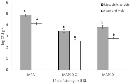 Mesophilic aerobic and yeast and mold counts in ready-to-eat table grape (cv. ‘Italia’) sealed in continuous polyethylene film under passive (MPA) and active modified atmosphere treated with chitosan (MAP10 C) and non-treated (MAP10) evaluated after the second shelf-life (14 days at 5 °C plus 5 days at 20 °C) (SL). Different lowercase letters indicate differences (Tukey’s test at p ≤ 0.05) between the treatments. Vertical bars represent standard error (n = 15).
