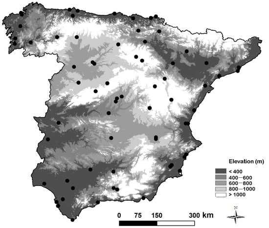 Daily meteorological observations at 72 georeferenced weather stations (Figure 1), all of them belonging to the Meteorology Agency of the Spanish Government, were obtained. A period of 40 years, from 1975 to 2015, was used in this work, which is much more than the optimal length for a series (30 years) recommended by the World Meteorological Organization with the aim of obtaining reliable climate data to make predictions []. The raw spatial database for all weather stations contained their geographic coordinates (referenced at UTM coordinates), elevation, and daily temperature (mean, maximum, and minimum) for the period 1975–2015.