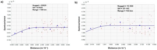 A multivariate geostatistical work was performed to estimate CH at any location in Spain. The regression-kriging algorithm, in which the linear regression was the one previously indicated, used as initial data for the main variable, CH, all values measured at each meteorological station. CH showed a clear spatial dependence (Figure 2); the experimental variogram was calculated and a theoretical spherical variogram was fitted to their points. Analysis of spatial correlation of residuals showed that the range of the variogram was smaller and the sill was bounded (Figure 2). This indicated that the drift had been removed. The spatial correlation structure described with the spherical variogram of residuals was integrated in the ordinary kriging algorithm to estimate CH residuals throughout Spain.