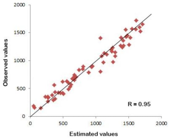 The accuracy of the kriged CH map was determined with a cross-validation process. The mean error, which evaluated the true prediction accuracy and was computed as the difference between estimated values and actual observations at each meteorological station, was 7.62. Moreover, the root mean square error, which evaluated the accuracy of the prediction, was 79.6. As the mean CH value was 831.8 (Table 1), the root mean square error was lower than 9.5% of the mean value. Furthermore, when the observed CH values versus the predicted values were plotted, the points fell close to the 45-degree line (Figure 3). Consequently, the CH map represents very closely the real spatial distribution of the winter chilling hours. This is in accordance with Hengl et al. [] who found that the accuracy of a model is higher when kriging of the residuals is incorporated in the prediction algorithm.