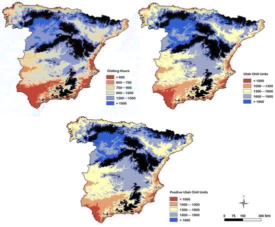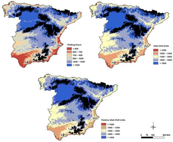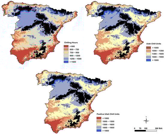 The geographic location of each area has a decisive influence on the temperature and the chill accumulation that can be recorded. Moreover, it is important to denote how the use of single climate stations to represent the climate within a region is not adequate because they cannot accurately characterize the level of spatial variability. Consequently, it is necessary to use adequate interpolation algorithms to properly perform the analysis about the spatial patterns of the studied climatic variables. Luedeling and Brown [] compared some winter chill models for fruit and nut trees throughout the world, with a poor coverage in many areas worldwide. However, the resolution of the maps they provided was not sufficient to accurately delineate chilling hours at national or regional levels. For instance, the distribution of chilling hours in Spain was too general, with only two or three classes throughout its territory.
