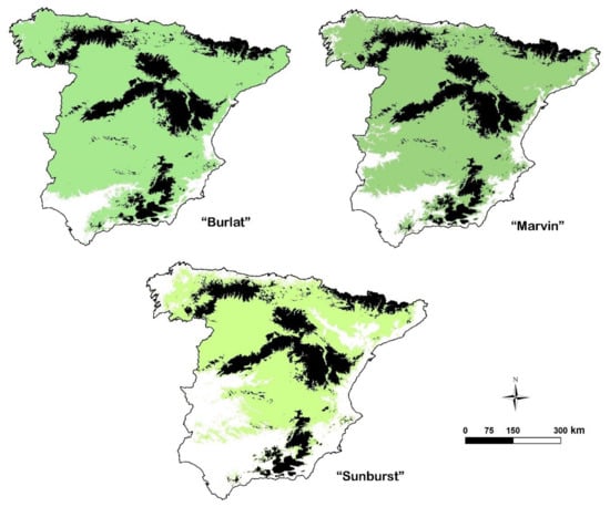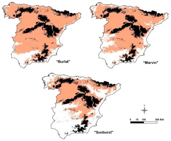 If a higher probability of satisfying the chilling requirements is desired, the 25% quantile map can be used to delineate the potential distribution of the sweet cherry cultivars (Figure 8), as it is likely that during 75% of the years, the requirements of winter chilling is achieved, that is, this metric defines the minimum amount of winter chill that growers can expect in 75% of all years. Thus, 66.3%, 55.8%, and 35.5% of the total area of mainland Spain, excluding the zones higher than 1000 m, are potentially suitable for “Burlat”, “Marvin”, and “Sunburst”, respectively.