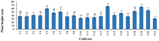 Plant height of different potato cultivars (two years pooled data); values with different lower case letters are significantly different between each other at the 5% level of significance (p ≤ 0.05); vertical bars represent the standard error of mean values.