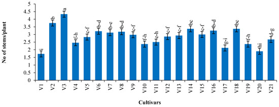 The number of stems/plants of different potato cultivars (two years pooled data); values with different lower case letters are significantly different between each other at the 5% level of significance (p ≤ 0.05); vertical bars represent standard error of mean values.