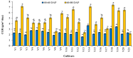 The crop growth rate of different potato cultivars during various stages of growth (two years pooled data); values with different lower case letters are significantly different between each other at the 5% level of significance (p ≤ 0.05); vertical bars represent standard error of mean values.