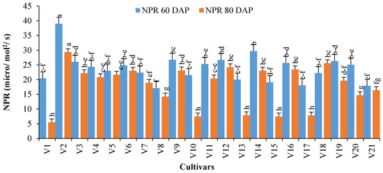NPR of different potato cultivars at 60 and 80 days after planting (estimation from two years pooled data); values with different lower case letters are significantly different between each other at the 5% level of significance (p ≤ 0.05); vertical bars represent standard error of mean values.