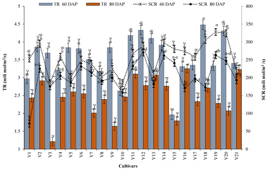 TR and SCR of different potato cultivars at 60 and 80 days after planting (estimation from two years pooled data); values with different lower case letters are significantly different between each other at the 5% level of significance (p ≤ 0.05); vertical bars represent standard error of mean values.