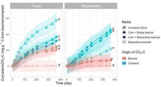 Cumulative CO2-C released during 1-year of incubation from fresh and weathered compost, Miscanthus biochar and both mixtures are presented in Figure 2. After 1 year of incubation, the fresh compost showed the highest cumulative C mineralization with values up to 30 mg g−1 of initial carbon. In contrast, very few C was mineralized from Miscanthus biochar. The isotopic signatures of carbon were used to assess the origin of C mineralized from biochar-compost mixtures. The data indicated that compost released between 15 and 20 mg g−1 C when incubated in mixtures, while biochar released between 10 and 15 mg g−1 C when incubated in mixtures. Compost showed lower C-mineralization in mixture compared to individual incubation. Conversely, biochar showed higher C-mineralization when combined with compost compared to individual incubation.