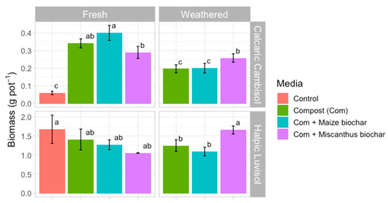 Biomass of ryegrass after addition of compost or its mixture with maize and Miscanthus biochars, grown on two soil types. Data are presented as means ± sd (n = 3). The letters represent the significant differences from a one-way ANOVA analysis (n = 4) within each treatment and soil type.