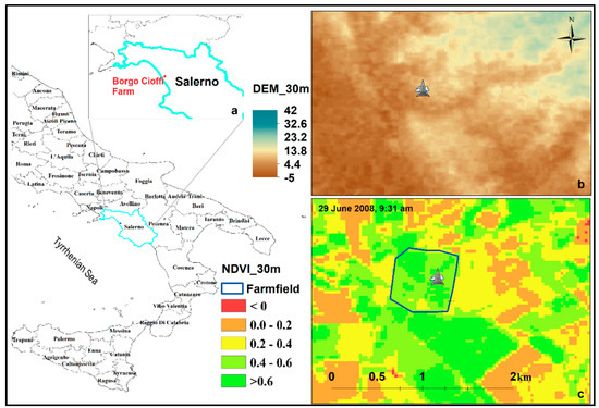 Showing (a) location, (b) ground elevation, and (c) vegetation status of maize rotational crop field lying in Southern Italy near the Tyrrhenian Sea at 5 m elevation a.s.l.