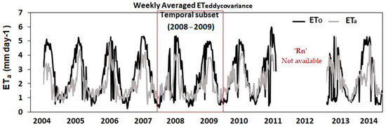 The time series analysis as presented in Figure 2, demonstrated the weekly averaged ET calculated for ten years (2004–2014), later, used as climate normal. The applied method is explained in Section 3.1 and Section 3.2. According to the magnitude, ETo was higher than ETa every year except 2012. Unparalleled ETo trends in the 2012 and 2013 series were due to the absence of measured net radiation (Rn) during January–April 2004 and September 2011–April 2013, which is a principal energy input in the ET estimation. To assess the accuracy of the energy balance models specifically, those unparalleled times series were excluded from the analysis, and only a subset of 2008–2009 was chosen wherein ETo was temporally aligned with ETa.