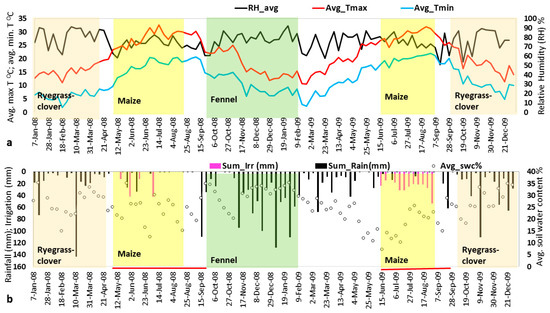 (a) Presenting weekly averages of minimum and maximum air temperature and relative humidity on the y-axis and week-days on the x-axis from 1 January 2008 to 31 December 2009. (b) Showing average soil water content % and a weekly sum of rain and irrigation. Colorful panels belong to different crop cycles in the study period. Red lines highlight field irrigation during non-rainy days before maize sowing in the complete maize–fennel–maize cropping period. This figure overall summarizes the irrigation management in the field under water stress conditions.