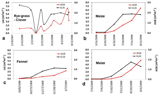 Measured leaf area index (LAI) and above ground biomass (AGB) for (a) rye-grass–clover 2008, (b) maize 2008, (c) fennel 2008–2009, (d) maize 2009 throughout each crop growing season on y-axis, the measurement dates are provided along the x-axis.