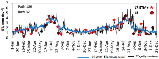 Measured weekly ET during the entire study period (2008–2009) and days corresponding to available Landsat image acquisition dates, along with ETa based climate normal (2004–2014) in the blue line. Red symbols marked temporal location of Landsat images with satellite types (Landsat 5 and Landsat 7 ETM+).
