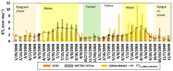 To confidently use ET tools in hydro-meteorological studies, it is important to assess their independent accuracies. Therefore, we analyzed, assessed, and applied three models (METRIC-EEFlux, SEBS, and QWaterModel) against EC-based ETa measurements. The results of our scatterplots and temporal analysis are shown in Figure 6 and Figure 7. According to the results, both SEBS and METRIC-EEFlux captured seasonal ETa estimations in correspondence with flux tower ETa, except for the QWaterModel. This model overestimated the ETa magnitude during the maize period in 2009. Among all three models, METRIC-EEFlux performed better as indicated by the error matrix (r2 = 0.65, RMSE = 1.13 mm day−1, MPE = 10.7%, MBE = 0.34) in Figure 7. This showed correspondence with measured ETa trends throughout crop cycles and was deemed reasonable in the case of short crops (fennel, rye-grass, clover). The performance of the SEBS was better than METRIC-EEFlux in terms of RMSE (r2 = 0.58, RMSE = 0.71 mm day−1, MBE = −0.05), however, was similar in MPE = 10.3% with the lowest MBE (−0.05). Though SEBS and METRIC-EEFlux had a comparable statistical evaluation, the results showed that METRIC-EEFlux overestimated ETa in summer 2008, whereas SEBS slightly underestimated, as illustrated in Figure 6. The 1:1 line in Figure 7 also indicated that METRIC-EEFlux overestimated the daily ETa of rotational crops for ETa values higher than 1.13 mm day−1, however, this was lower by SEBS in comparison (RMSE = 0.71 mm day−1).