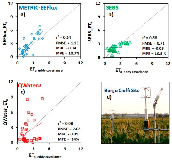 One-to-one comparison of modeled ETa on y-axis and measured ETa on x-axis for the study period using the results of three single-source energy balance models: (a) METRIC-EEFLUX, (b) SEBS, and (c) QWaterModel with (d) camera image of the eddy covariance system installed on the IT_BCi site, whose measurements used for validation. In comparison, SEBS showed the lowest error and METRIC-EEFlux showed highest congruence with EC based estimation while QWaterModel showed scattered behavior with the validation data.
