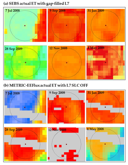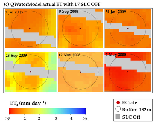 Figure 8 showed only those images where scanlines were observed over the flux site with the METRIC-EEFlux and QWaterModel based ET product. It illustrates that the use of intermediary products of METRIC-EEFlux also has no advantage if the scan line issue persists. Thus, gap-filling of METRIC-EEFlux end products is equally important to get a better ETa output over the rotational crop field to avoid different spatial ETa ranges by each model. The map also highlights the indifferent response by the QWaterModel-based ETa in the L7 SLC-off based product.