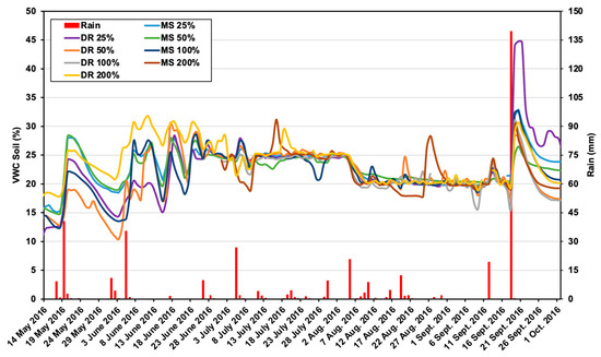 Soil volumetric water content (VWC) for the different combinations of drip (DR) and micro-sprinkler (MS) irrigation with different fertilizer levels (25, 50, 100, and 200%) in 2016. Rain events are shown as vertical bars. From 14 May 2016 to 22 June 2016, the irrigation system was being tested and the irrigation was controlled by hand, trying to keep the VWC above 25%. After 23 June 2016, the automated irrigation network was turned on, following the thresholds established (from early May to early August: VWC threshold of 25%; from early August to mid-September: VWC threshold of 20%; from mid-September to late September: VWC threshold of 15%; late September to December: irrigation off). Values are the average of four sensors (two at 20 cm and two at 40 cm depth).
