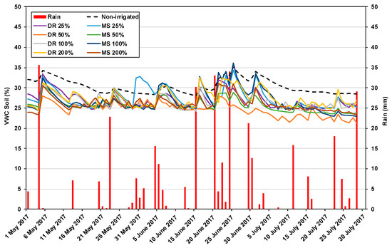 Soil volumetric water content (VWC) for the non-irrigated treatments and for the different combinations of drip (DR) and micro-sprinkler (MS) irrigation with different fertilizer levels (25, 50, 100, and 200%) in 2017. Rain events are shown as vertical bars. The automated irrigation network was activated in 12 May 2017, with the intent of following the thresholds established (from early May to early August: VWC threshold of 25%; from early August to mid-September: VWC threshold of 20%; from mid-September to late September: VWC threshold of 15%; from late September to December: irrigation off). The system was damaged and deactivated after 28 July 2017 because of a lightning strike. For the irrigated treatments, the values are the average of four sensors (two at 20 cm and two at 40 cm depth). For the non-irrigated, values the are averages of 32 sensors (16 at 20 cm and 16 at 40 cm depth).