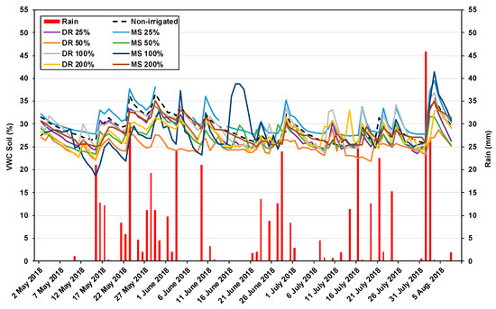 Soil volumetric water content (VWC) for the non-irrigated treatments and for the different combinations of drip (DR) and micro-sprinkler (MS) irrigation with different fertilizer levels (25, 50, 100, and 200%) in 2018. Rain events are shown as vertical bars. The automated irrigation network was activated on 7 May 2018, with the intent of following the thresholds established (from early May to early August: VWC threshold of 25%; from early August to mid-September: VWC threshold of 20%; from mid-September to late September: VWC threshold of 15%; from late September to December: irrigation off). However, the system was damaged and the data were not recorded from 8 August 2018 to 5 September 2018. For the irrigated treatments, the values are the average of four sensors (two at 20 cm and two at 40 cm depth). For the non-irrigated treatment, the values are the average of 32 sensors (16 at 20 cm and 16 at 40 cm depth).