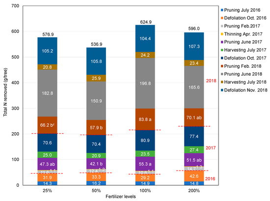 Total N removed per tree for the different fertilizer levels (25, 50, 100, and 200%) of the “Julyprince” peaches in 2016, 2017, and 2018. For each removal event (different colors), the means are shown inside the bars. z Means followed by a different letter within a removal event are significantly different by Tukey’s honestly significant different test, P ≤ 0.05. Means without letters indicate non-statistical differences, P > 0.05.