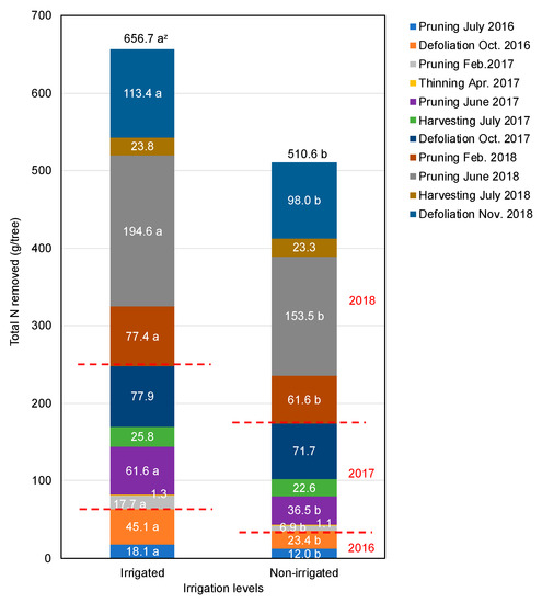 Total N removed per tree for the different irrigation levels (irrigated vs. non-irrigated) of “Julyprince” peaches in 2016, 2017, and 2018. For each removal event (different colors), the means are shown inside the bars. z Means followed by a different letter within a removal event are significantly different by Tukey’s honestly significant different test, P ≤ 0.05. Means without letters indicate non-statistical differences, P > 0.05.
