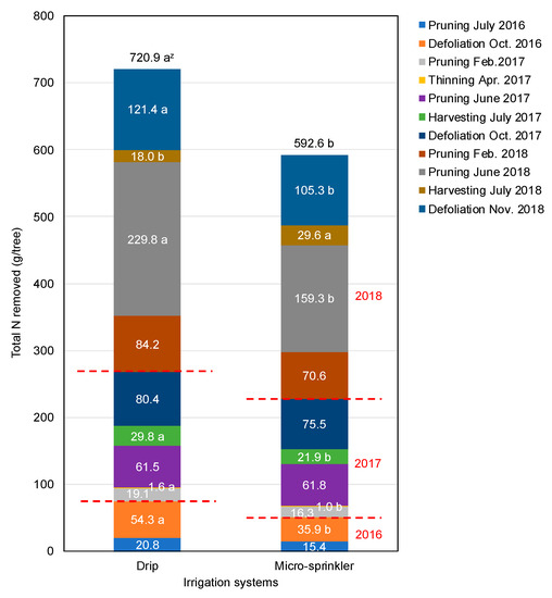 Drip irrigation delivered 3065 L/tree of water, averaged over fertilizer levels and totaled over the three years of the experiment, whereas micro-sprinkler irrigation delivered 4743 L/tree. This accounts for a reduction of 35% by using drip-irrigation. Drip-irrigated trees had more N removed (720.9 g/tree) in comparison with micro-sprinkler-irrigated trees (592.6 g/tree) (P = 0.004) (Figure 6). These differences were mainly driven by differences found in the amount of N removed from defoliation in 2016 and 2018, summer pruning in 2018, fruit harvested in 2017 and 2018, and fruit thinning in 2017 (Figure 6).