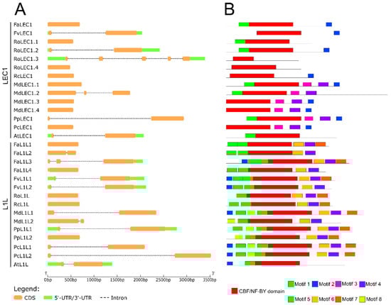 LEC1 and LIL1 gene and protein structures in Rosaceae species and Arabidopsis thaliana. (A) Exon–intron structure of LEC1 and L1L genes. (B) CBF-A/NF-YB domain and motifs in LEC1 and L1L proteins. LEC1: LEAFY COTYLEDON1; L1L: LEAFY COTYLEDON1-LIKE; Fa: Fragaria × ananassa; Fv: Fragaria vesca; Ro: Rubus occidentalis; Rc: Rosa chinensis; Md: Malus × domestica; Pp: Prunus persica; Pc: Pyrus communis; At: Arabidopsis thaliana. A list of accession numbers for protein sequences is available in Table S3.