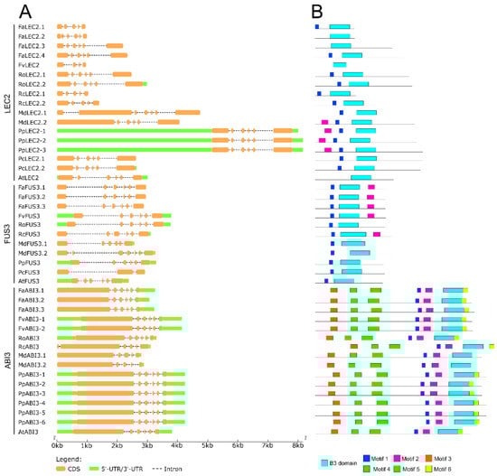LEC2, FUS3, and ABI3 gene and protein structures in Rosaceae species and Arabidopsis thaliana. (A) Exon–intron structure of LEC2, FUS3, and ABI3 genes. (B) B3 domain and motifs in LEC2, FUS3, and ABI3 proteins. LEC2: LEAFY COTYLEDON2; FUS3: FUSCA3; ABI3: ABSCISIC ACID INSENSITIVE3; Fa: Fragaria × ananassa; Fv: Fragaria vesca; Ro: Rubus occidentalis; Rc: Rosa chinensis; Md: Malus × domestica; Pp: Prunus persica; Pc: Pyrus communis; At: Arabidopsis thaliana. A list of accession numbers for protein sequences is available in Table S3.