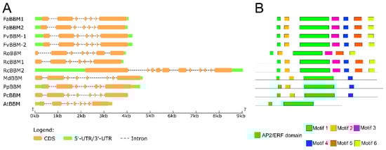 BBM gene and protein structures in Rosaceae species and Arabidopsis thaliana. (A) Exon–intron structure of BBM genes. (B) AP2/ERF domain and motifs in BBM proteins. BBM: BABYBOOM; Fa: Fragaria × ananassa; Fv: Fragaria vesca; Ro: Rubus occidentalis; Rc: Rosa chinensis; Md: Malus × domestica; Pp: Prunus persica; Pc: Pyrus communis; At: Arabidopsis thaliana. A list of accession numbers for protein sequences is available in Table S3.
