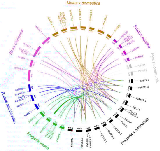 Chromosomal location and comparison of syntenic relationships between LEC1, L1L, LEC2, FUS3, ABI3, and BBM genes for Fragaria × ananassa and other species of the Rosaceae family. FaLEC2.3 did not present synteny with any genes of Rosaceae species and it was excluded from the figure. Chromosomes for each species are indicated by color rectangles. Gene names for each species are indicated outside the circle. Colored lines indicate syntenic gene pairs between F. × ananassa and other species from the Rosaceae family. LEC1: LEAFY COTYLEDON1; L1L: LEAFY COTYLEDON1-LIKE; LEC2: LEAFY COTYLEDON2; FUS3: FUSCA3; ABI3: ABSCISIC ACID INSENSITIVE3; BBM: BABYBOOM; Fa: Fragaria × ananassa; Fv: Fragaria vesca; Ro: Rubus occidentalis; Rc: Rosa chinensis; Md: Malus × domestica; Pp: Prunus persica; Pc: Pyrus communis. Additional information about syntenic blocks is available in Table S4.