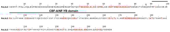 To gain insights into amino acid sites subjected to positive selection, the calculation of Ka/Ks values at each protein position were performed (Figure 5 and Table S5). A total of 59 specific sites showed positive selection (Ka/Ks = 1.3–1.5, Table S5) and were represented in the FaL1L3 sequence (Figure 5). The CBF-A/NF-YB domain presented 18 residues with positive selection, although most of them were part of lower conserved regions (Figure 5).