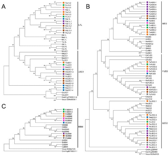 Proteins phylogenetic relationships of LAFL-B within the Rosaceae family. (A) Phylogenetic tree for LEC1 and, L1L. (B) Phylogenetic tree for LEC2, FUS3, and ABI3. (C) Phylogenetic tree for Babyboom (BMM) proteins. Numbers in nodes of the phylogenetic trees indicate bootstrap values (1000 replicates). Orthologous sequences of green algae Volvox carteri and Chlamydomonas reindhartii were used as outgroup. Color circles indicate proteins of different Rosaceae species. LEC1: Leafy cotyledon1; L1L: Leafy cotyledon1-like; LEC2: Leafy cotyledon2; FUS3: Fusca3; ABI3: Abscisic acid insensitive3; BBM: Babyboom; Fa: Fragaria × ananassa; Fv: Fragaria vesca; Ro: Rubus occidentalis; Rc: Rosa chinensis; Md: Malus × domestica; Pp: Prunus persica; Pc: Pyrus communis; At: Arabidopsis thaliana; Ca: Coffea arabica; Cc: Coffea canephora; Dl: Dimocarpus longan; Me: Manihot esculenta; Mt: Medicago truncatula; Tc: Theobroma cacao. A list of accession numbers for protein sequences is available in Table S3.