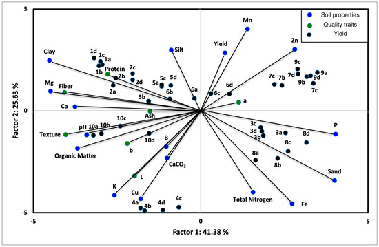 According to the PCA plot, the texture, fiber, protein, clay, Mg, Ca, pH and OM had a negative effect on PC1 and the total nitrogen, silt, CaCO3, Fe and K had a negative effect on PC2, while the sand, P and Zn had a positive effect on PC1 and the Mn, silt and yield had a positive effect on PC2. Furthermore, there are correlations between the Mg and fiber, clay and protein, pH and texture, and between L, B, K, Cu and CaCO3. Based on PCA score plot of the tested samples, four main groups of samples were noted. The groups are (a) 1a, 1b, 1c, 1d, 2a, 2b, 2c, 2d (b) 5a, 5b, 5c, 5d, 6a, 6b, 6c, 6d (c) 10a, 10b, 10c, 10d (d) 3a, 3b, 3c, 3d, 8a, 8b, 8c, 8d and (e) 7a, 7b, 7c, 7d, 9a, 9b, 9c, 9d.