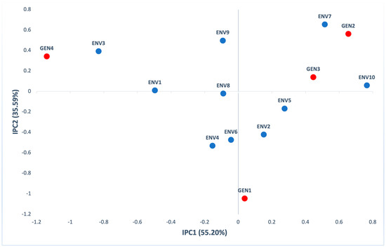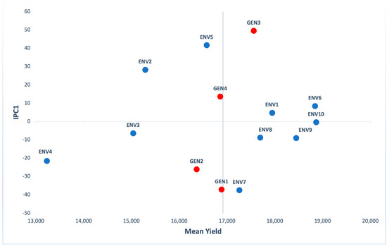Additive main effects and multiplicative interaction (AMMI) biplot presenting mean grain yield (kg/ha) and the first interaction principal components axis (IPC1) of 4 genotypes (red) evaluated in 10 environments (blue).