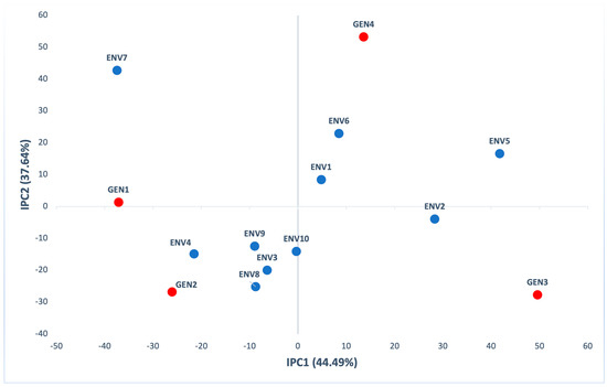The first two principal components in AMMI analysis were significant (p < 0.001), explaining 90.79% of GxE (55.20% IPC1 and 35.59% IPC2) of interaction variation (Table S3). According to the biplot of the first (IPC1) and the second (IPC2) interaction principal components (Figure 7), GEN2 had a large positive interaction with ENV7, GEN4 had a large positive interaction with ENV3, while GEN3 had a positive interaction with ENV10.