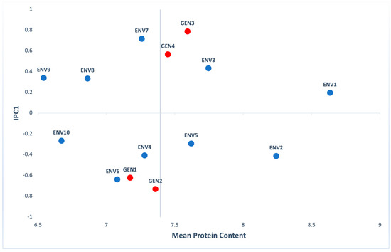 AMMI biplot presenting mean protein content and the first interaction principal components axis (IPC1) of 4 genotypes (red) evaluated in 10 environments (blue).