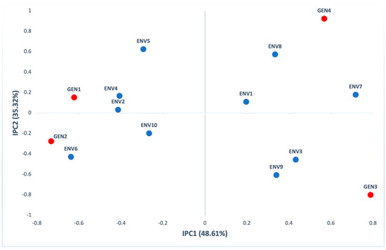 The first two principal components in AMMI analysis were significant (p < 0.001), explaining 82.13% of GE (44.49% IPC1 and 37.64% IPC2) of interaction variation (Table S3). According to the biplot of the first (IPC1) and the second (IPC2) interaction principal components (Figure 3), GEN2 had a positive interaction with five out of ten environments (ENV3, ENV4, ENV8, ENV9 and ENV10). Generally, all genotypes were located far from the biplot origin and contribute to the G×E interaction for yield. AMMI analysis is widely used for the evaluation of maize hybrids yield in multienvironment field trials [20,24,25,41,42,43], and grain yield of wheat varieties [22,36,44,45,46], seed yield of oilseed rape [23], nutritional composition of sweet potato [38], yield of sugarcane [47] and yield of chickpea [48].