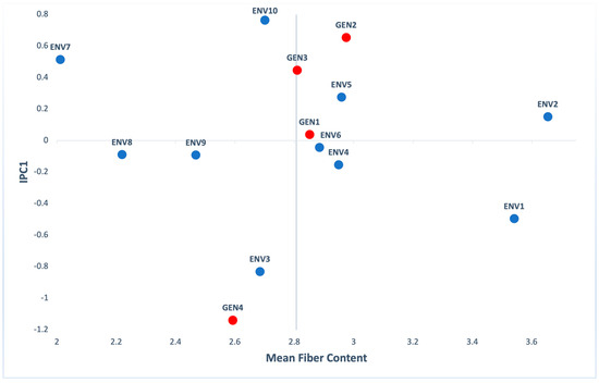 AMMI biplot presenting mean fiber content and the first interaction principal components axis (IPC1) of 4 genotypes (red) evaluated in 10 environments (blue).