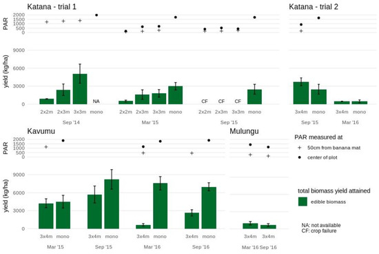 Crop performance of amaranth in various intercrop formations and monocrops at the study sites Katana, Kavumu and Mulungu. Edible aboveground biomass yields are indicated for each intercrop formation and cropping season. At Katana, the crop failure (CF) in September 2015 is indicated. The annual crop in monocrop formation is not assessed (NA) at Katana in September 2014 and not available in trial 2 at Mulungu. Photosynthetic active radiation (PAR) measured at the center of the plot (full circle) and 50 cm from the banana mat (cross) is indicated for each annual intercrop and monocrop. Note that during some stages of the experimental trial PAR measurements are not available due to temporary equipment defects.