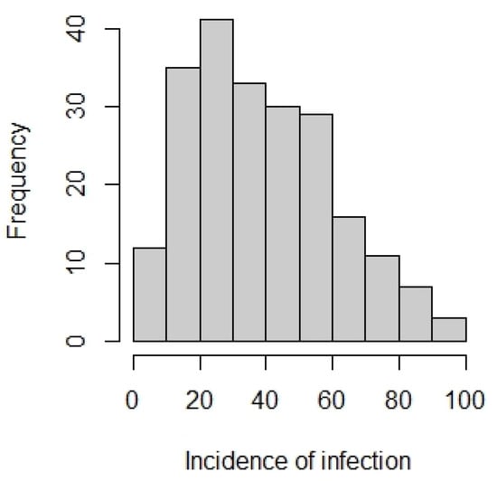 In this work, a three-year experiment of artificial inoculation under controlled conditions with a high virulent isolate of P. graminea was performed to assess the resistance of a collection of 206 spring two-row European barley cultivars. Together with the isolate Dg2, the isolate Dg5 used here was the most virulent when tested on a large collection of barley cultivars [5]. A continuous variation in the average incidence of infection was observed, with a distribution skewed towards resistant phenotypes (Figure 1). Similar distribution of phenotypic classes frequency suggesting quantitative resistance to leaf stripe disease has been already observed in barley [10,11,12,16].