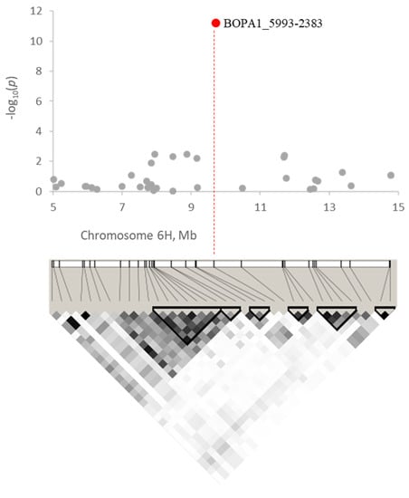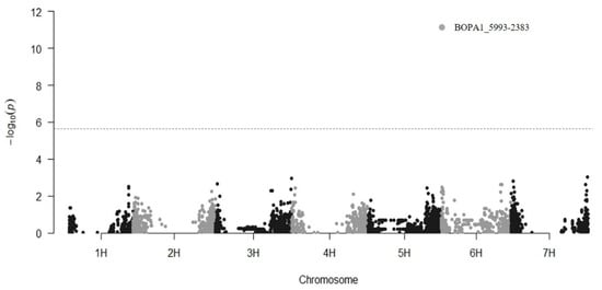 The phenotypic data collected on the spring barley population were associated with 4016 informative genome-wide SNP markers to identify genomic regions associated with P. graminea resistance. When considering the mean incidence of infection over the three replications of the experiment or data from the single experiments, mixed linear models in Tassel identified a single, highly significant SNP (−log10(P) = 11.2; FDR-corrected p < 1 × 10−4) on the short arm of chromosome 6H, at position 9,712,203 (Figure 2 and Supplementary File, Figures S2 and S3). This SNP (BOPA1_5993-2383) does not segregate uniformly in the barley population under analysis; in fact, the reference “A” allele was observed in 192 genotypes out of 206 (93.2%), while the alternative “T” allele was present in 11 genotypes (5.3%). For 3 cultivars, it was not possible to assign an allele at this locus.